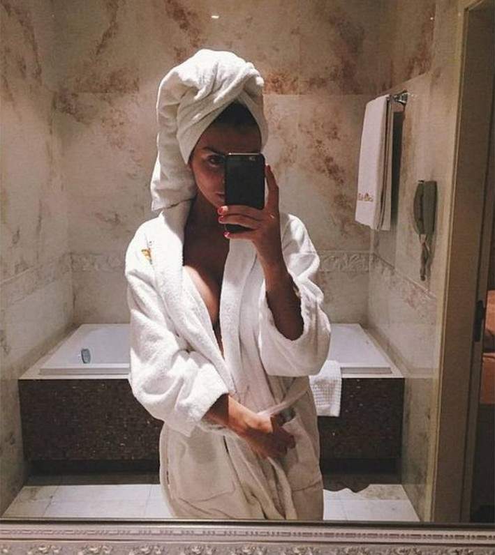 Красивая девушка с полотенцем на голове селфи.