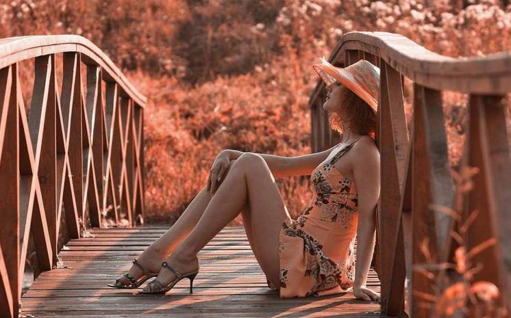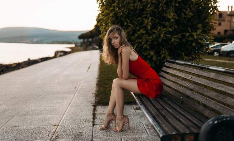 Рыжеватая модель на лавке.