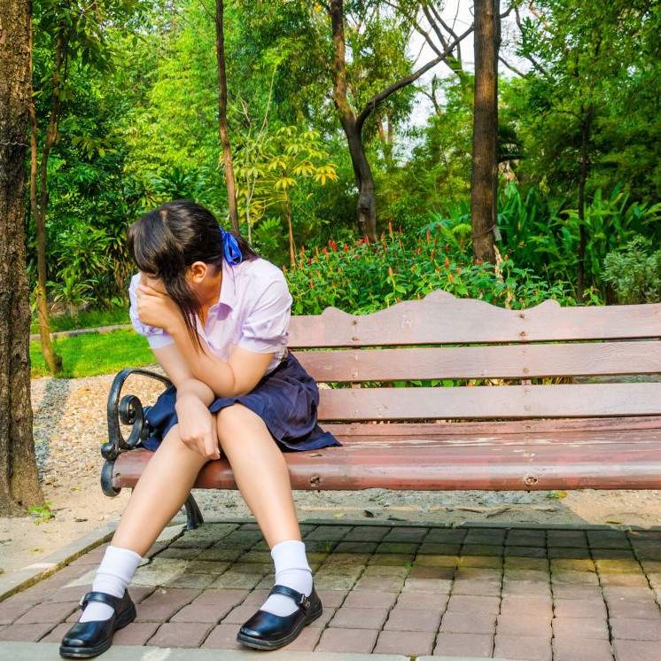 Красивая девушка рыдает на лавочке.