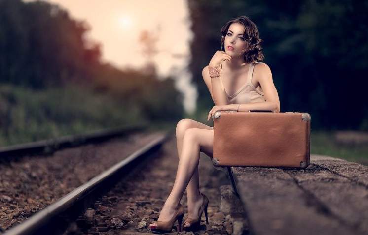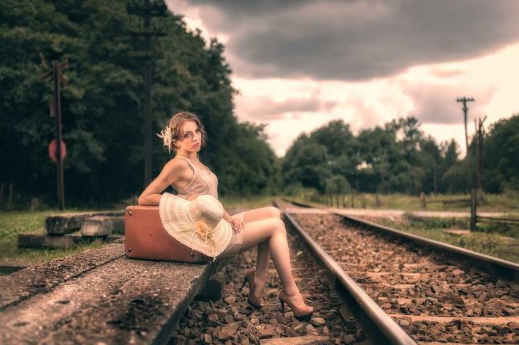 Фотосессия с чемоданом на рельсах.
