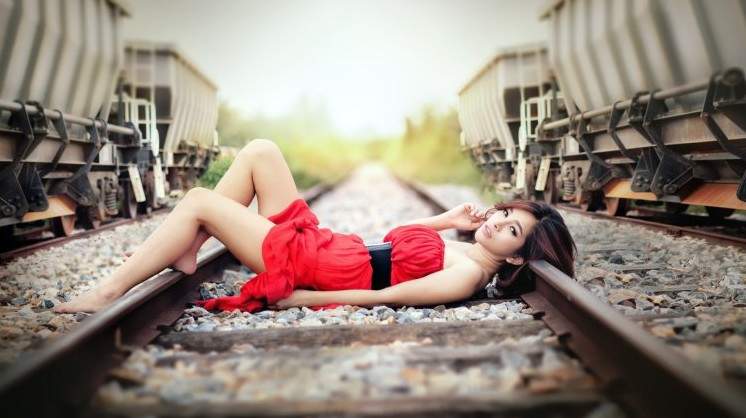 Девушка в Красном на рельсах.