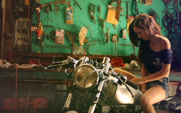 Девушка в байк гараже фотосессия.