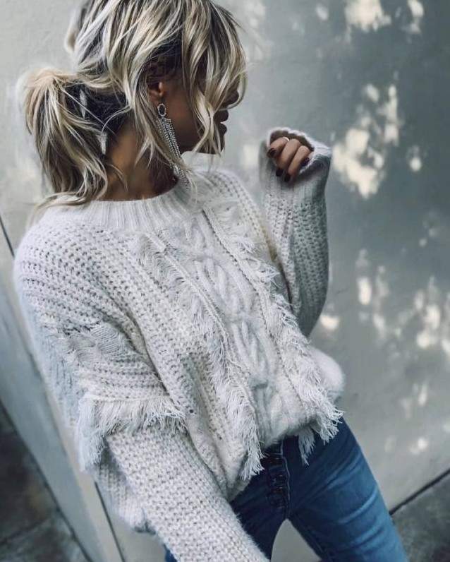 Блондиночка в белом свитере.
