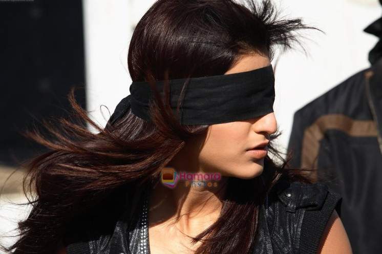 Слепая девушка с повязкой на очах.