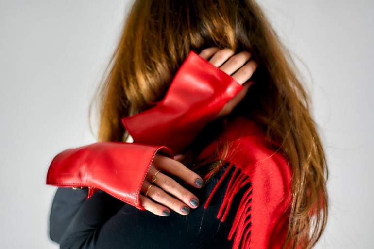 Красивая женщина в красных кожаных перчатках.