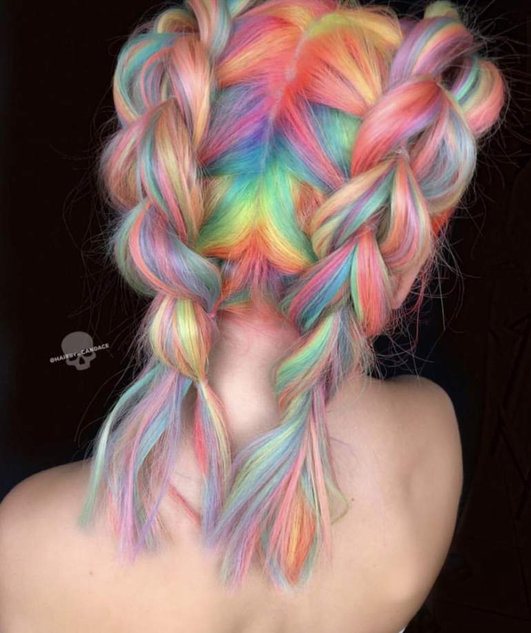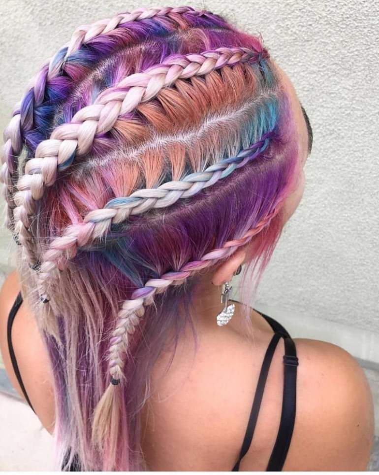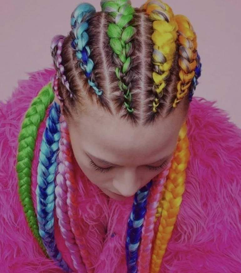 Прическа с разноцветными косичками.