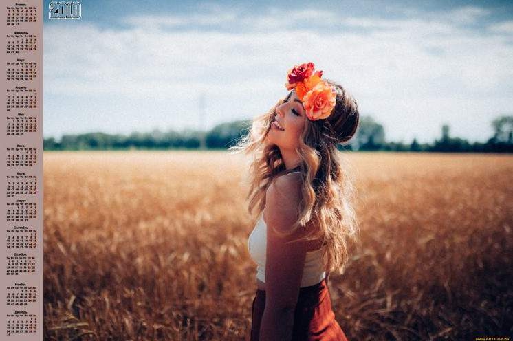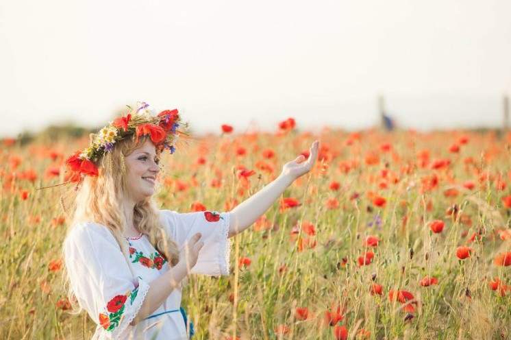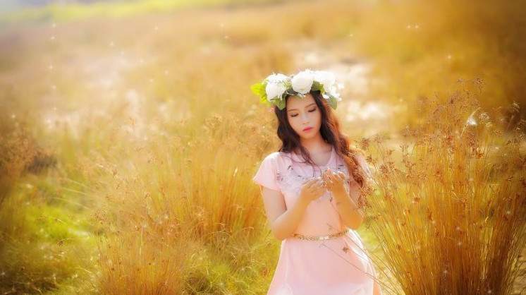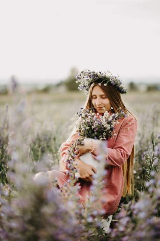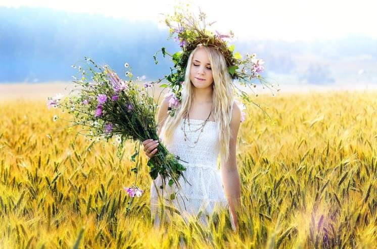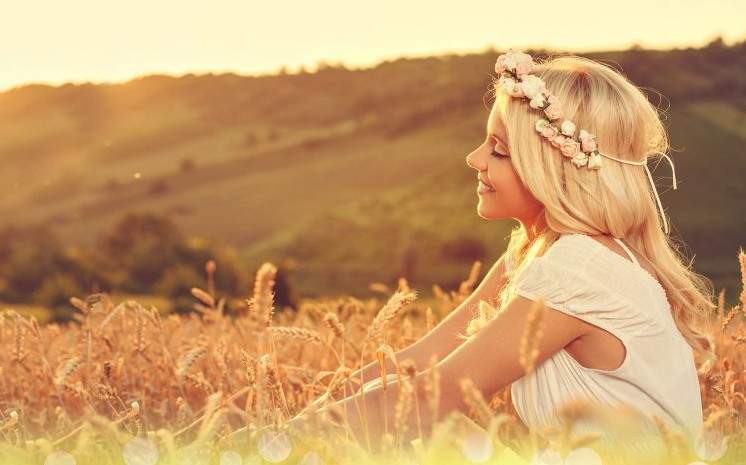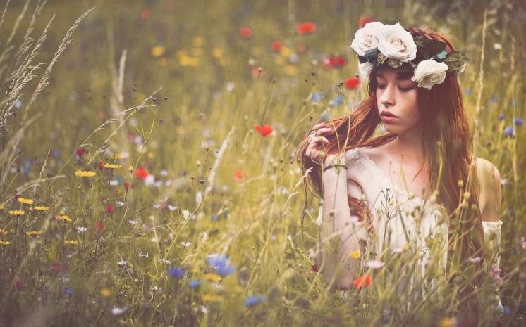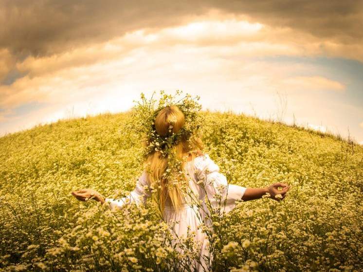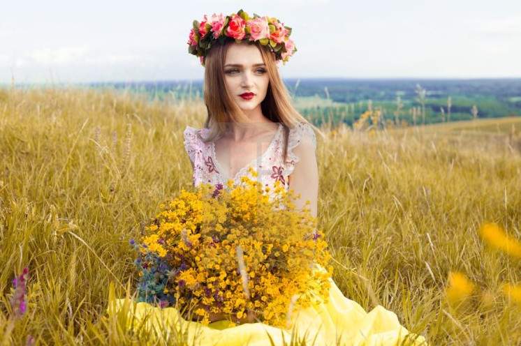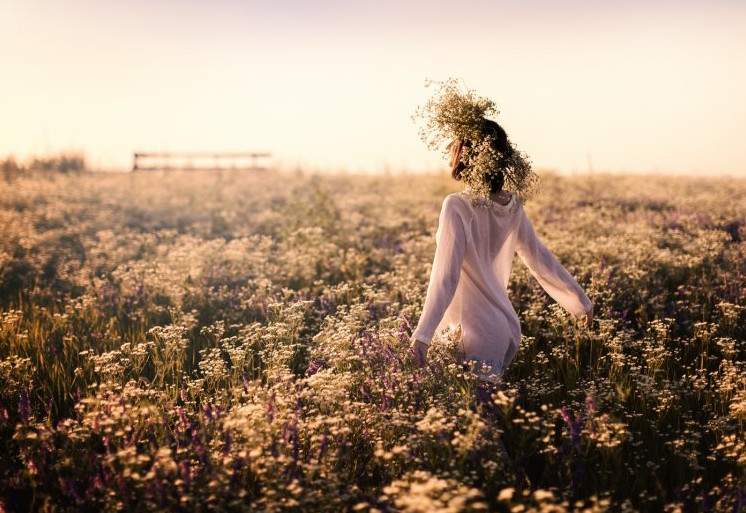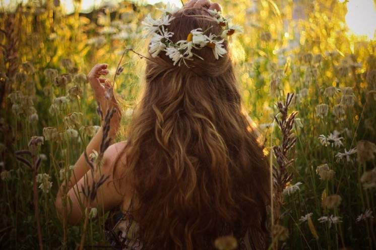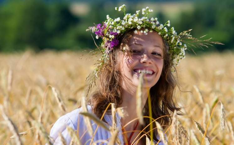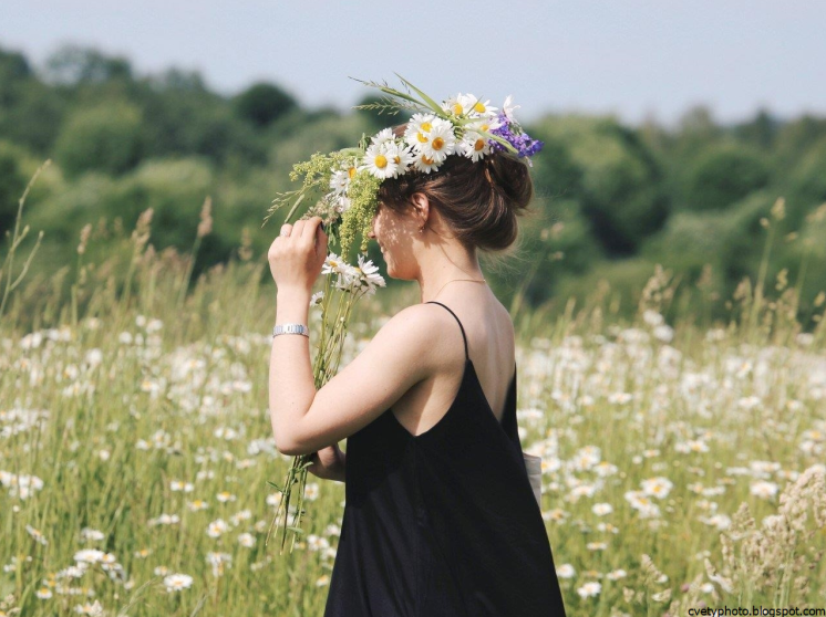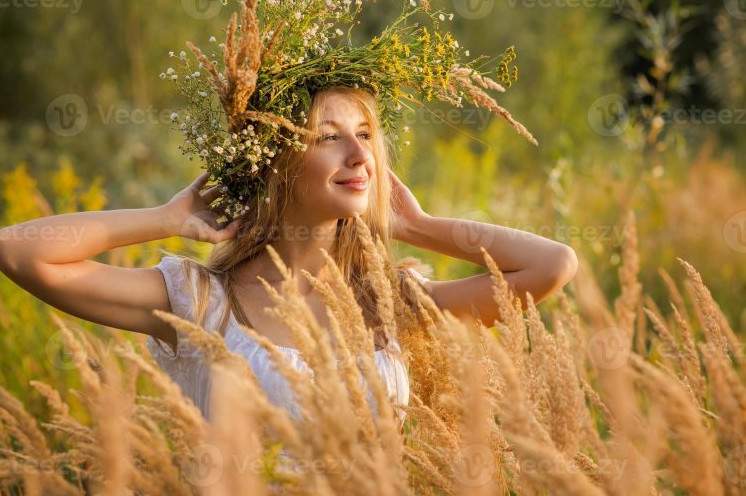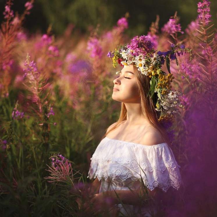 Девушка в поле с венком на голове.