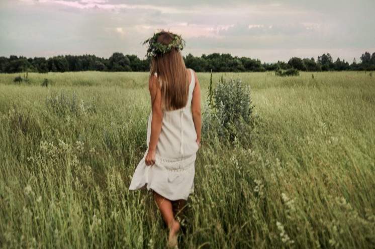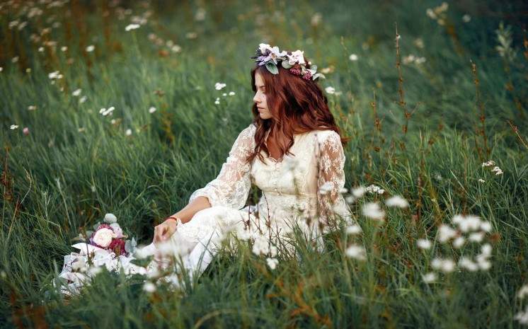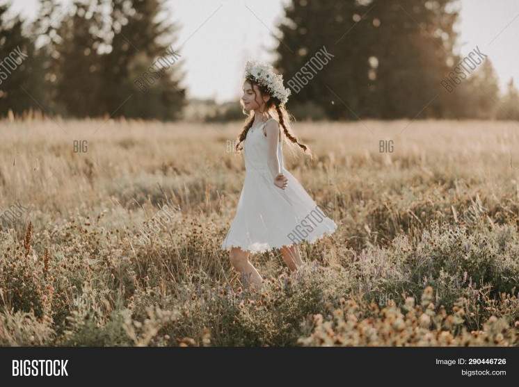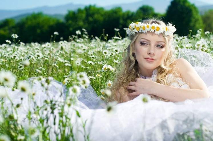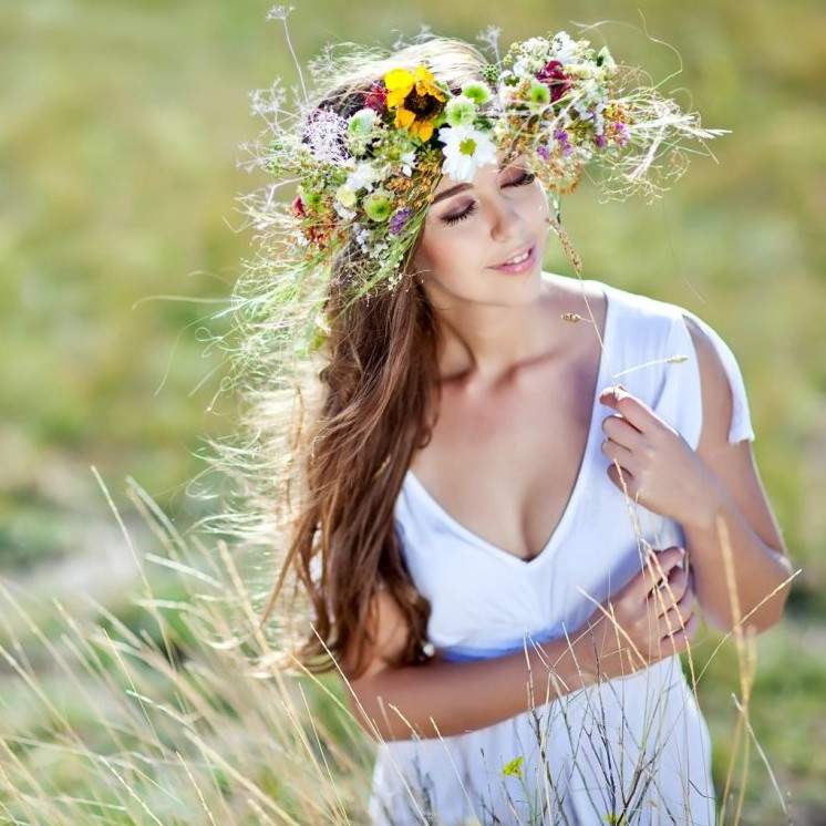 Восхитительные женщины в белоснежных платьицах в венках в поле.