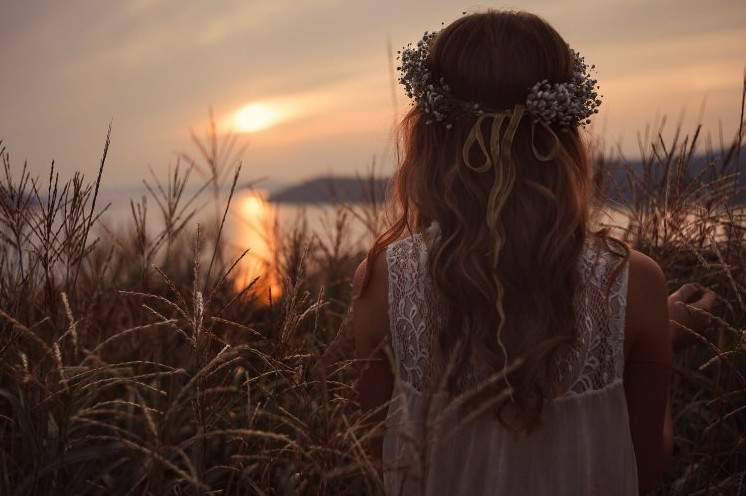 Красивая девушка с венком на голове со спины.