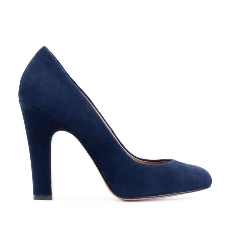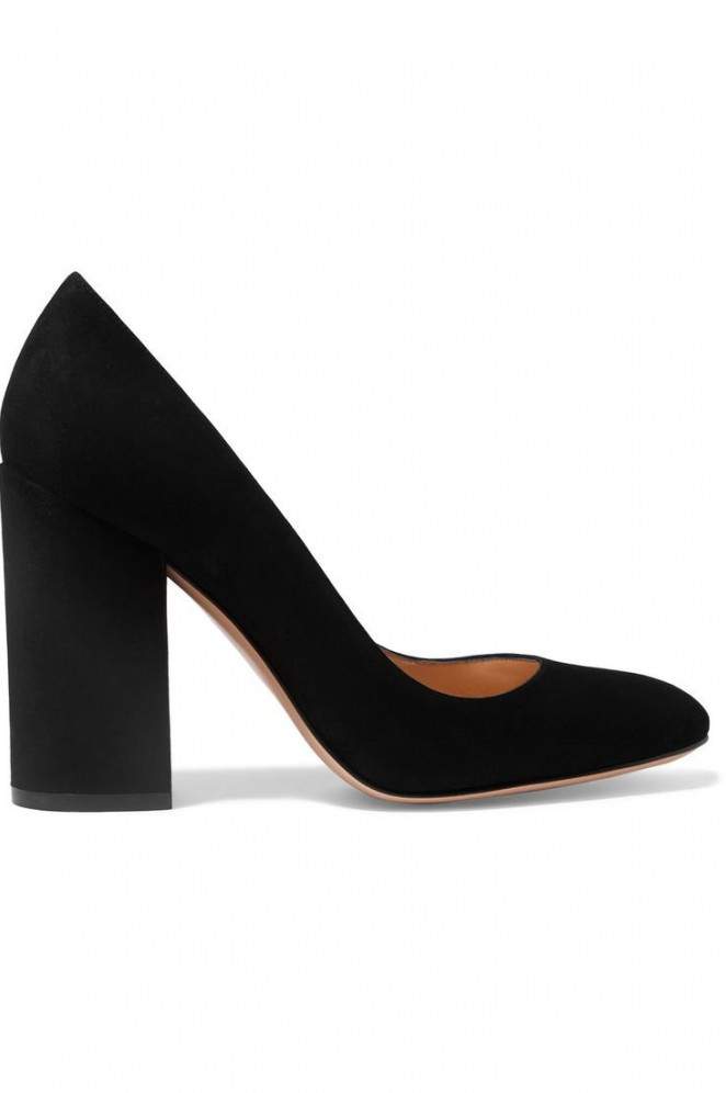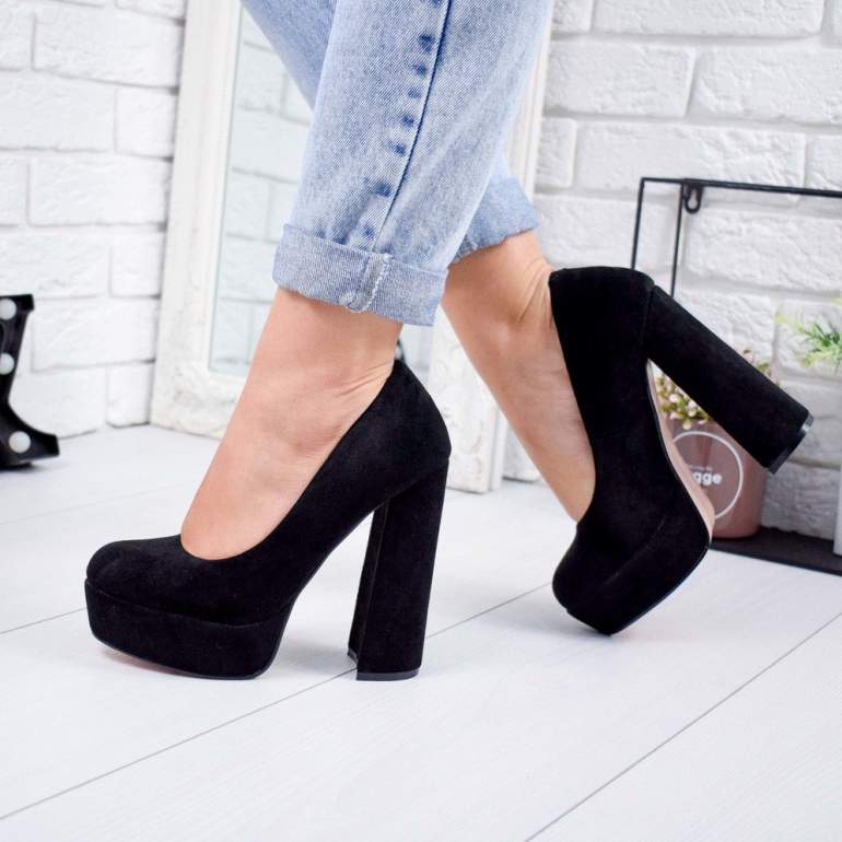 Темные замшевые туфли на широком каблуке.