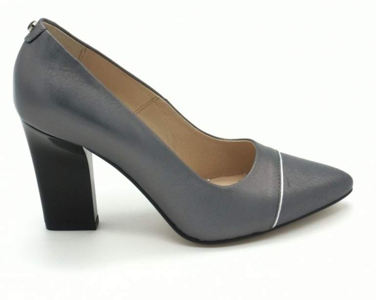 Сероватые туфли на устойчивом каблуке.