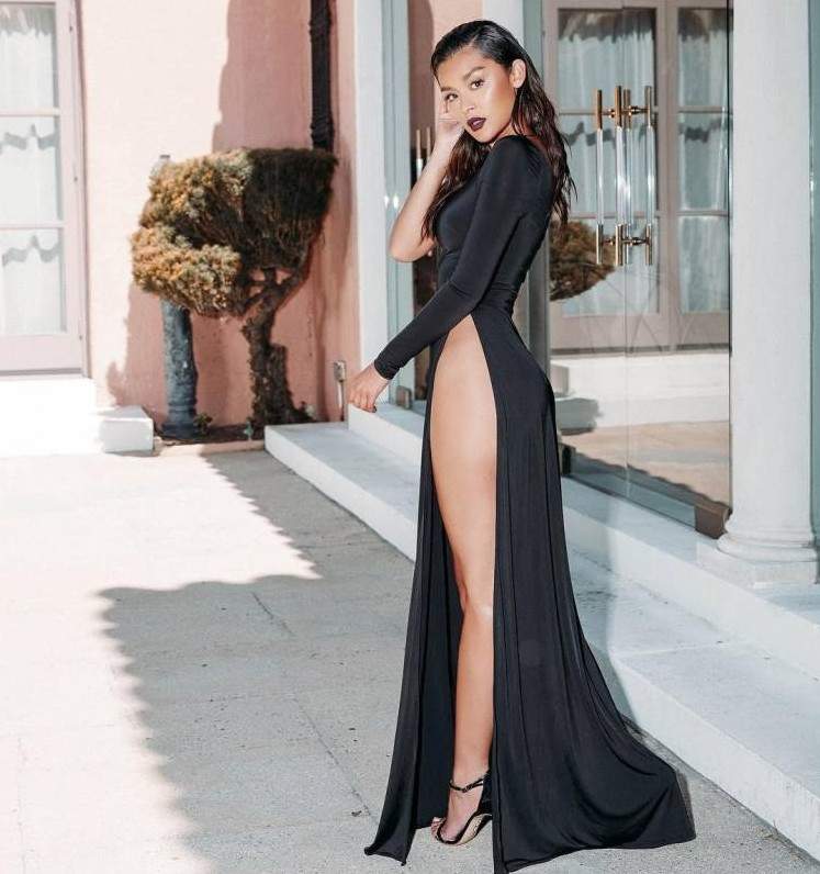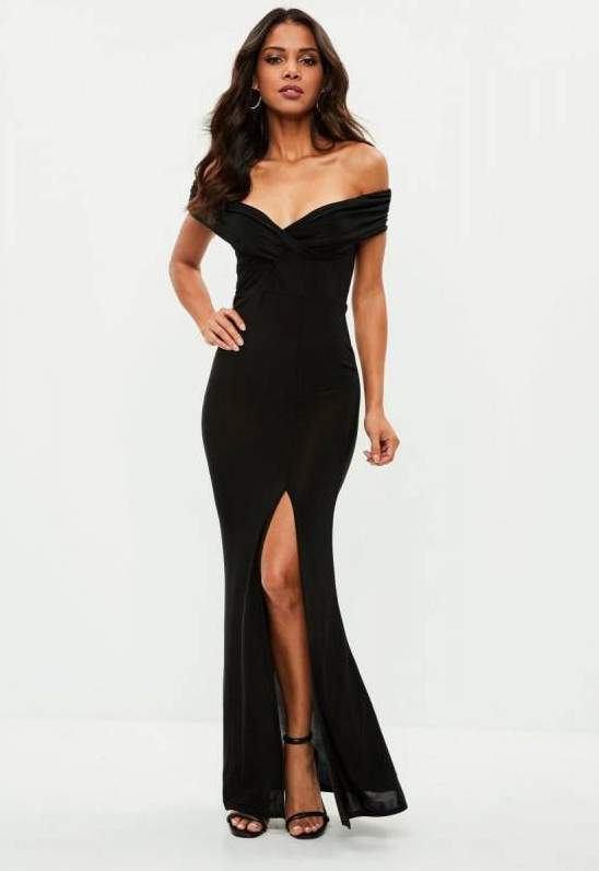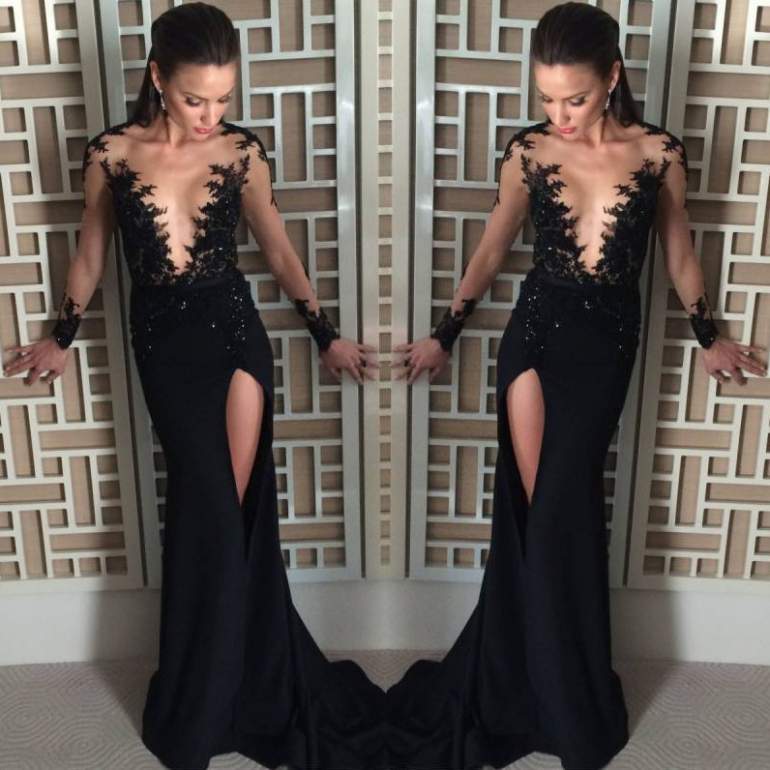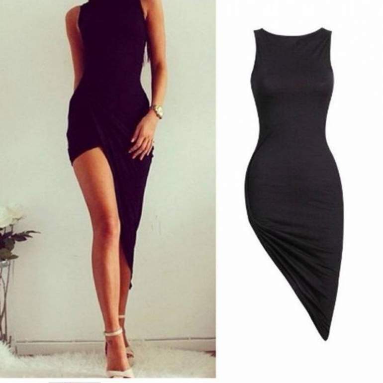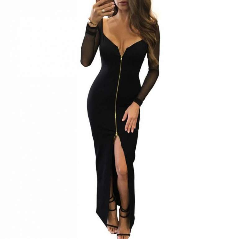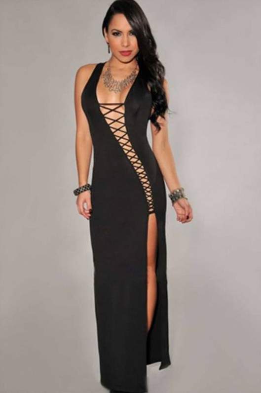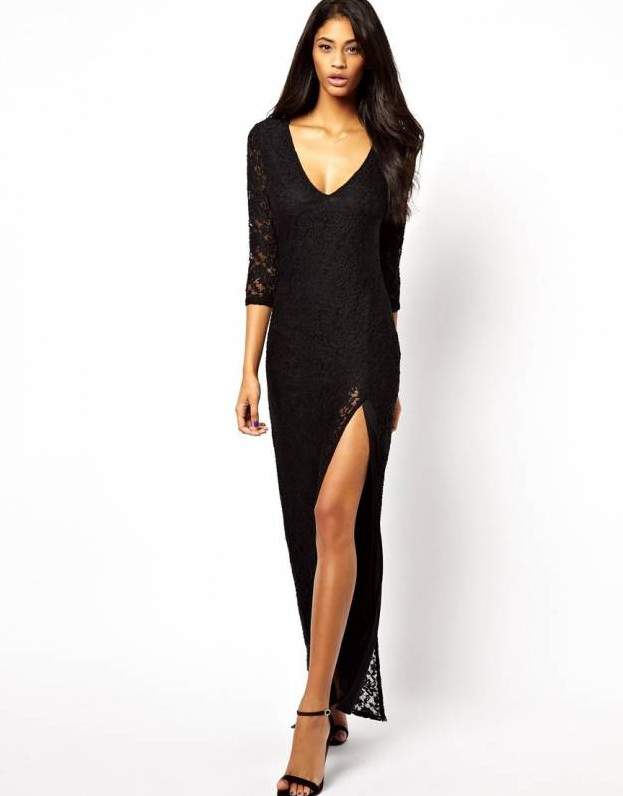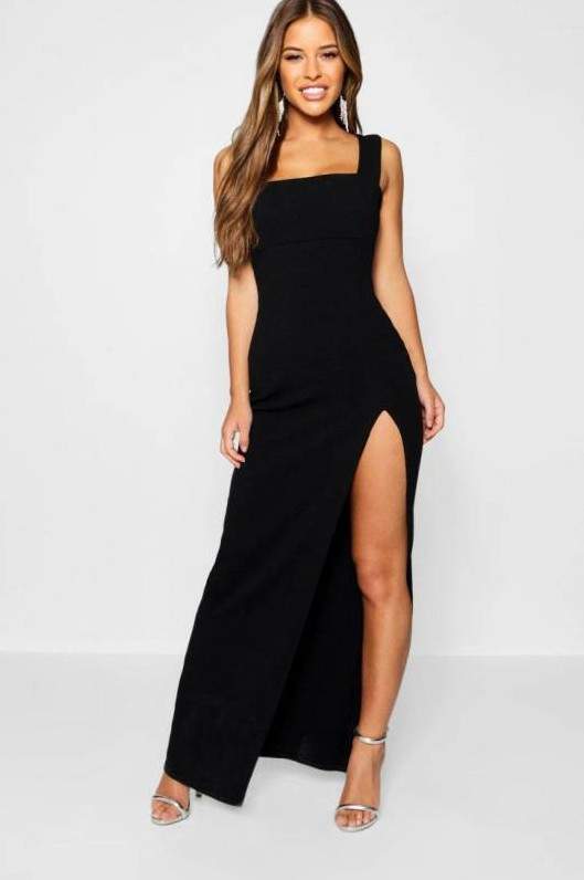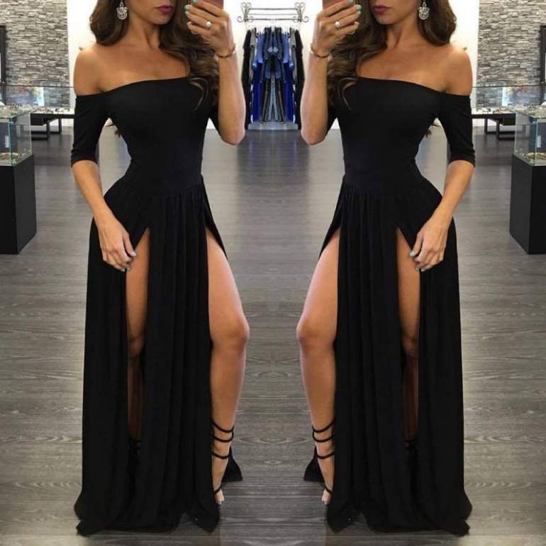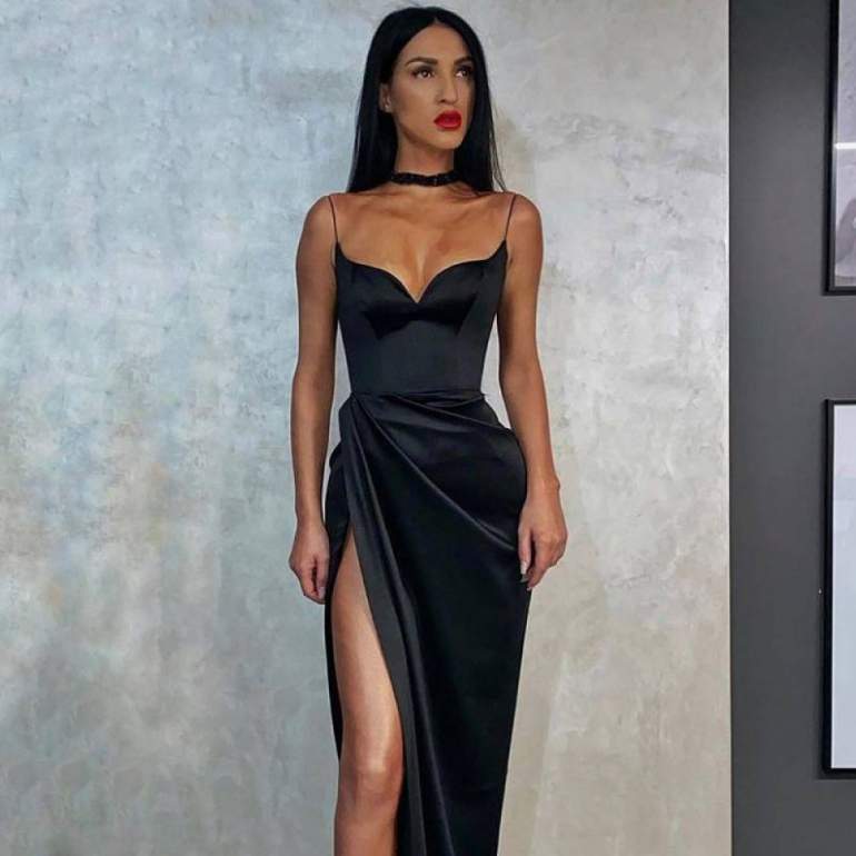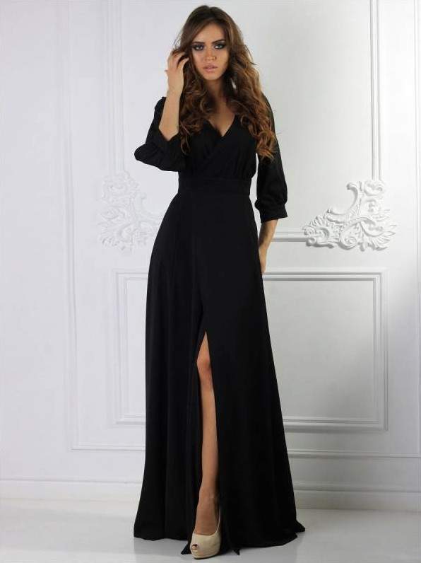 Чёрное платье с вырезом на ноге.