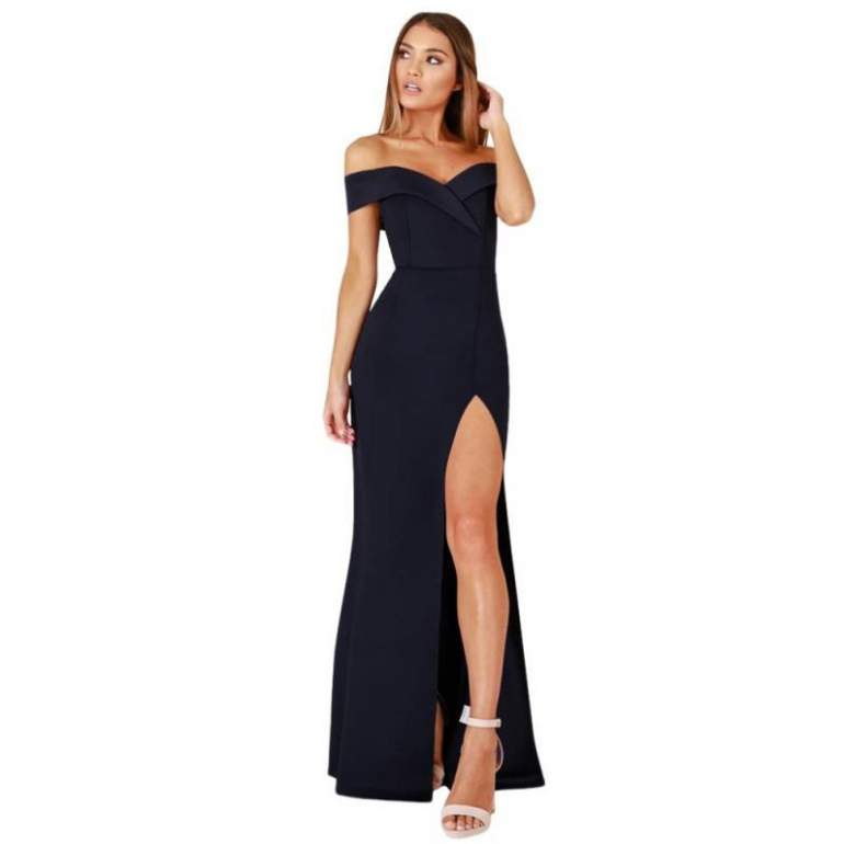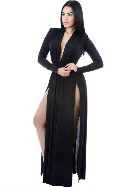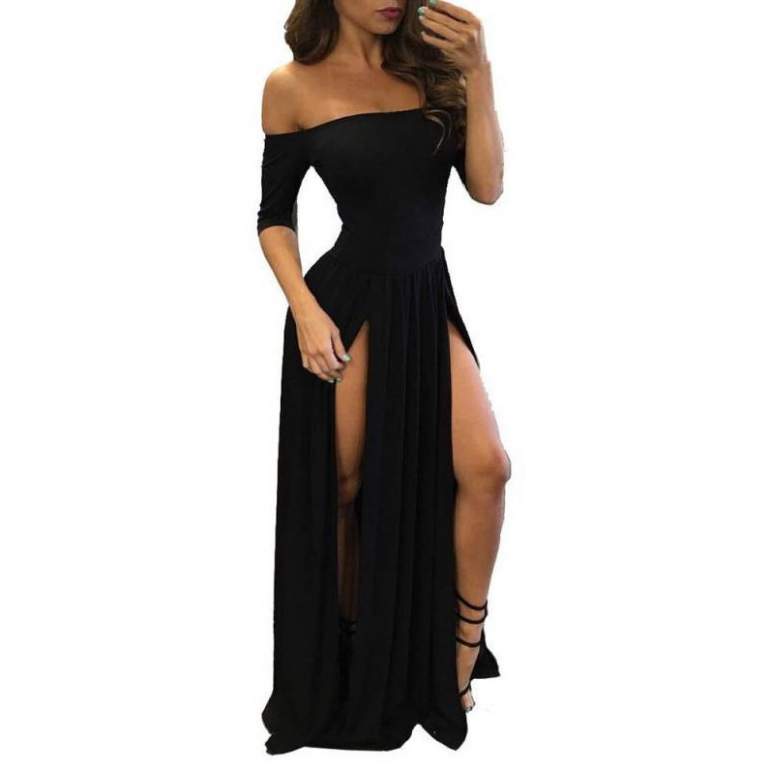 Темное платье с разрезом.
