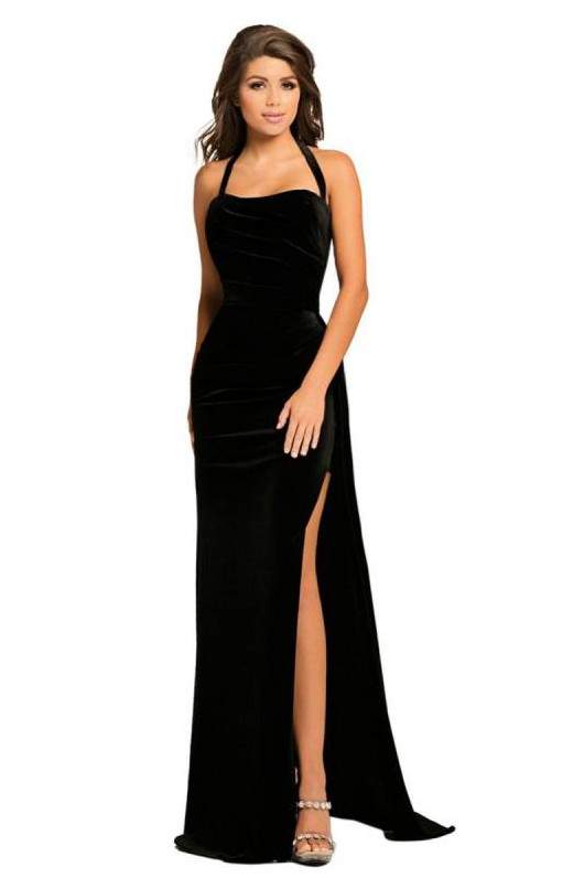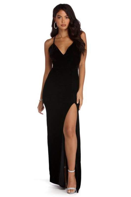 Темное бархатное платье с разрезом.