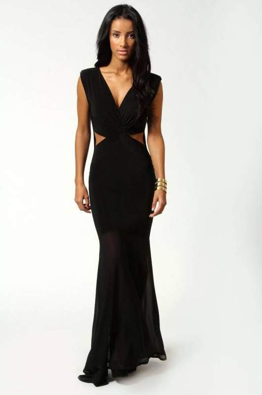 Темное длинноватое платье с вырезом.