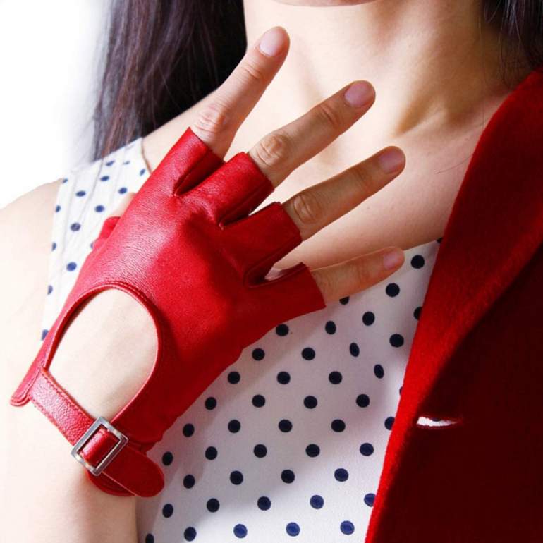 Очень красные кожаные перчатки без пальцев.