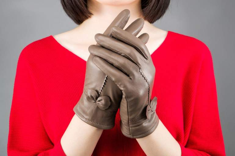Красивая женщина в кожаных перчатка.