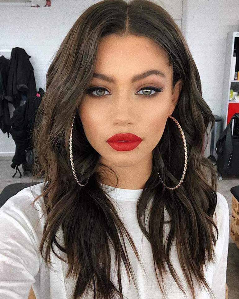 Брюнетка с очень красными губами.