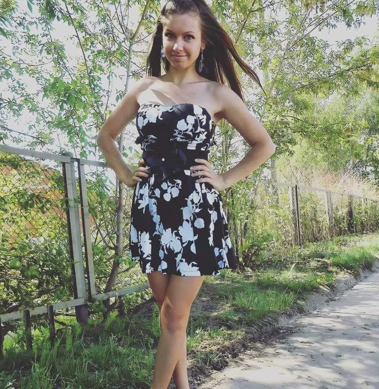Красивая девушка в небольшом облегающем прекрасное платье из соцсетей.