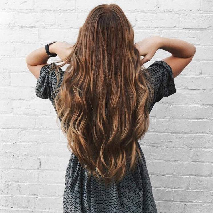 Длинные каштановые волосы.