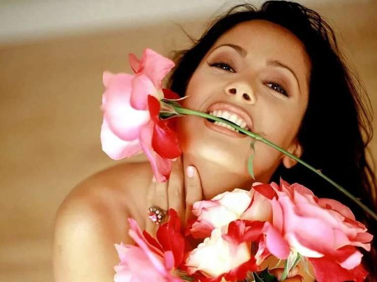Девушка с цветком в зубах.