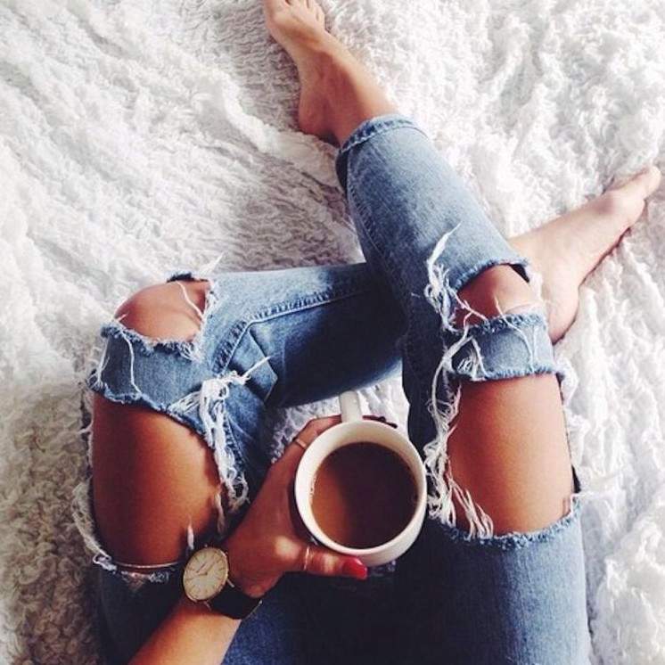 Девушка в рваных джинсах с кофе.