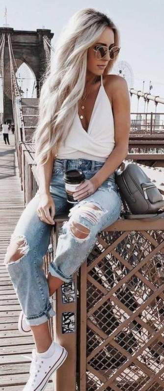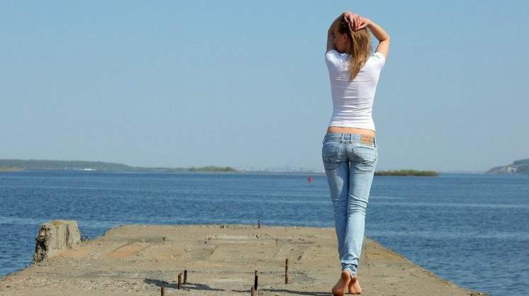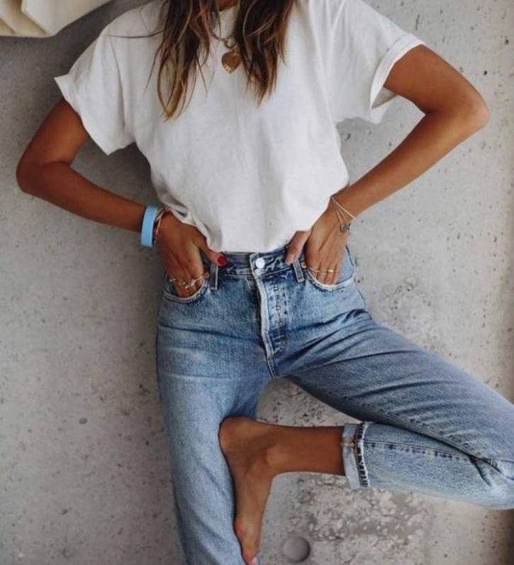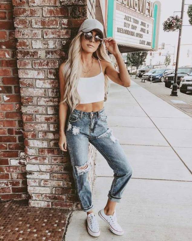Девушка в майке и джинсах.
