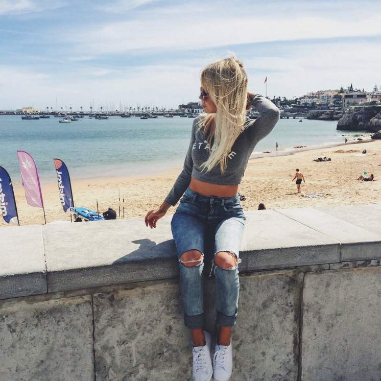 Блондиночка в рваных джинсах.
