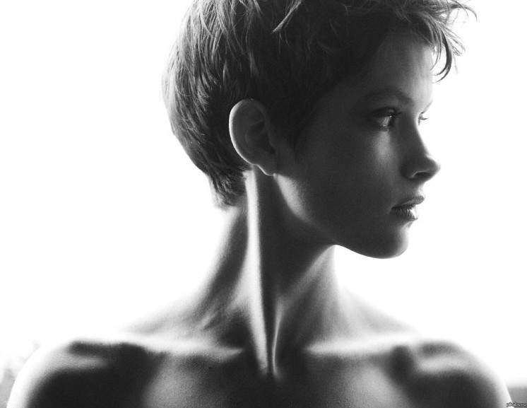 Худенькая эротика с брюнеткой с короткой стрижкой.