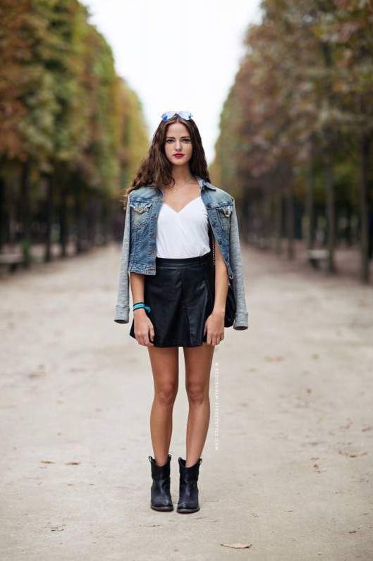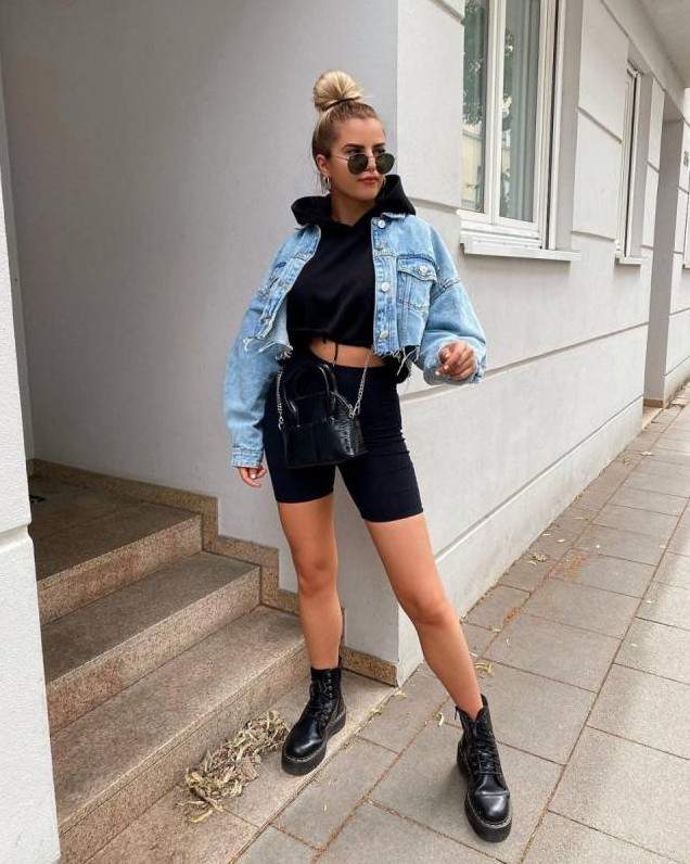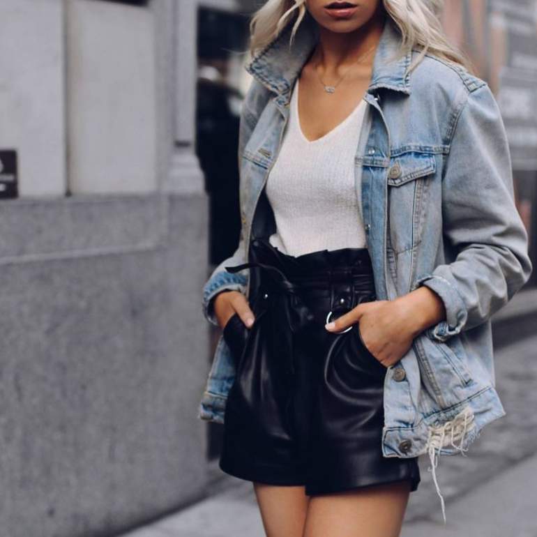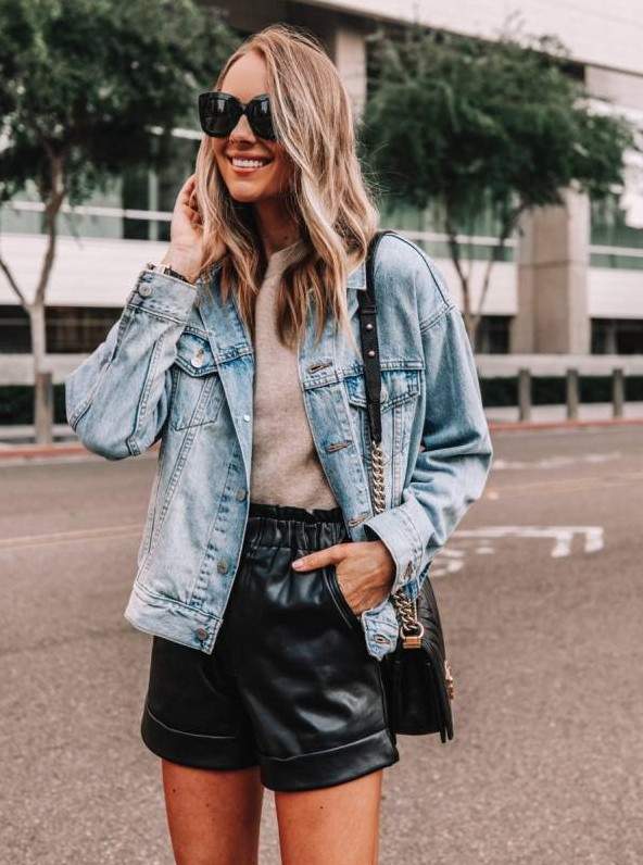 Кожаные шорты с джинсовой курткой.