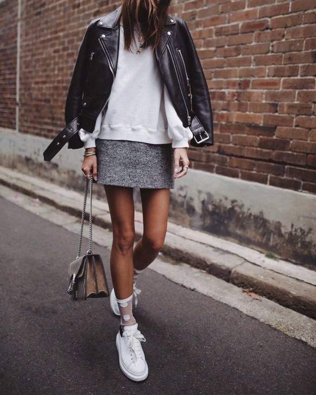Кожаная юбка с кедами.