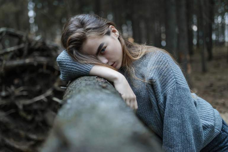 Грустная девушка красавица в лесу.