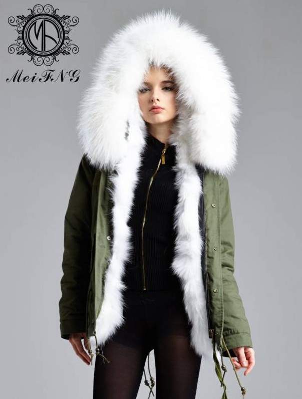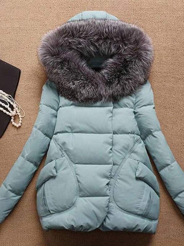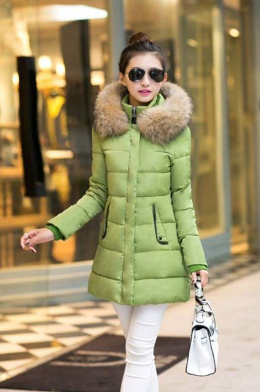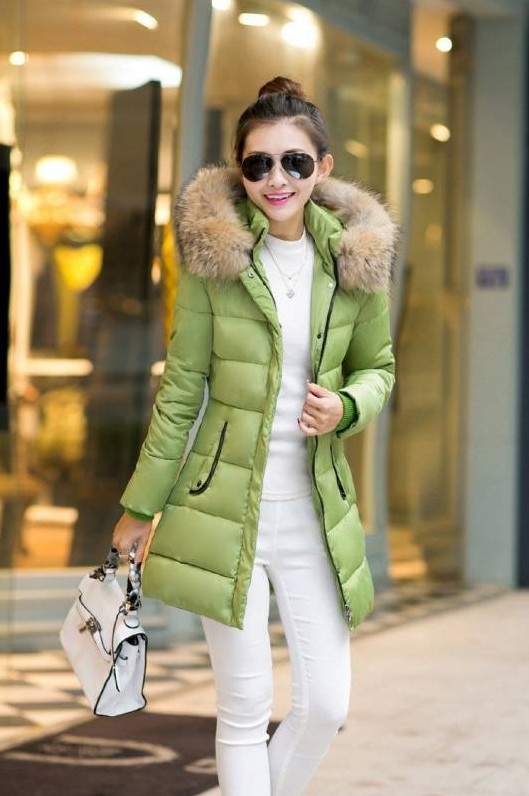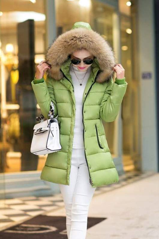Зеленоватый пуховик с белоснежным мехом.
