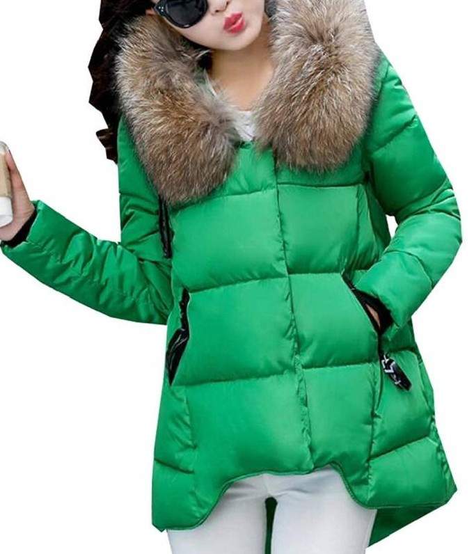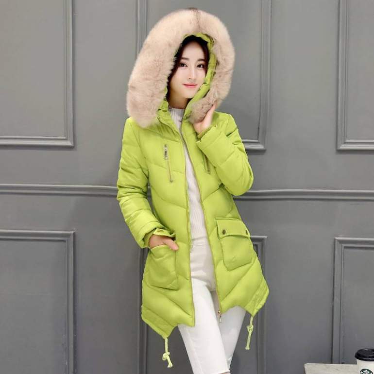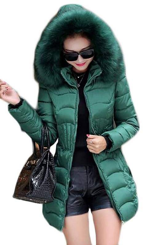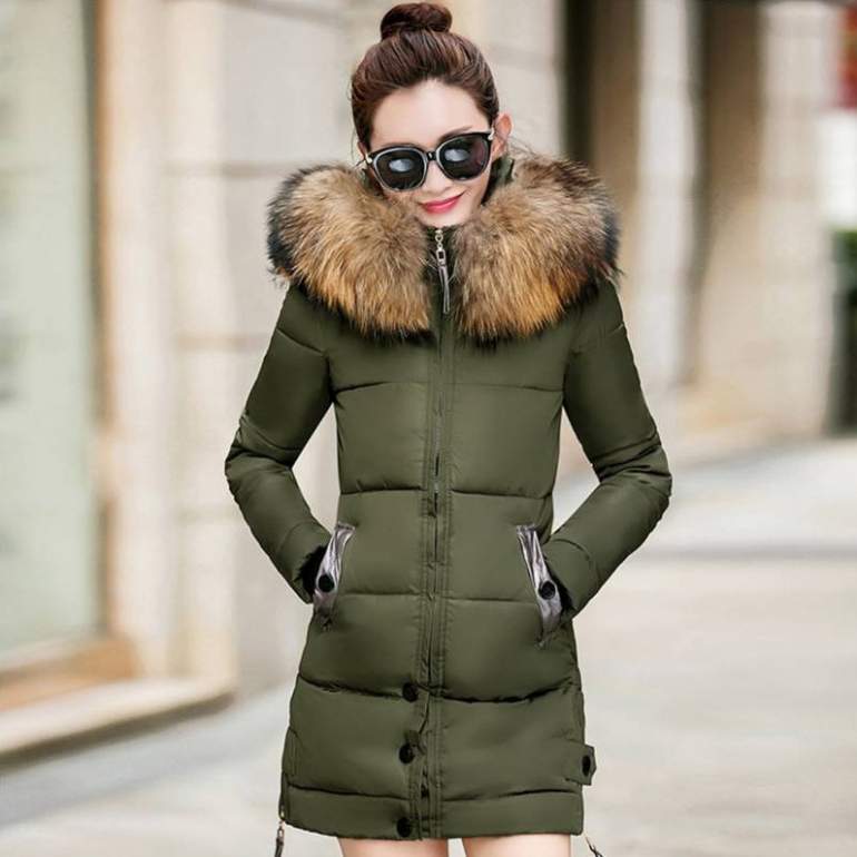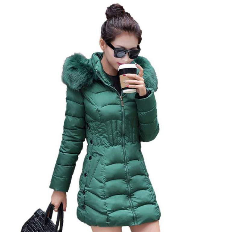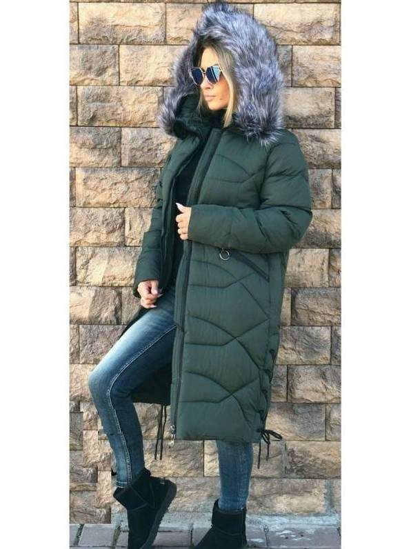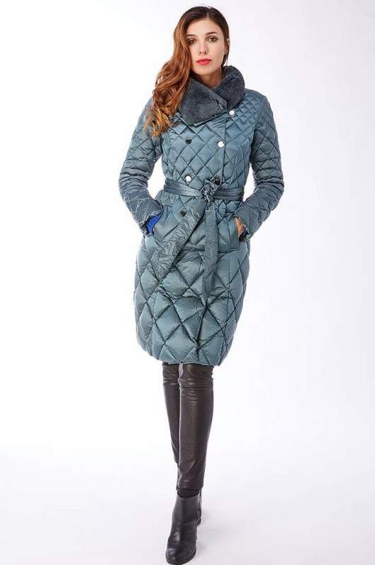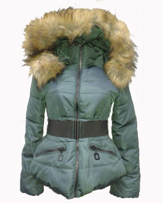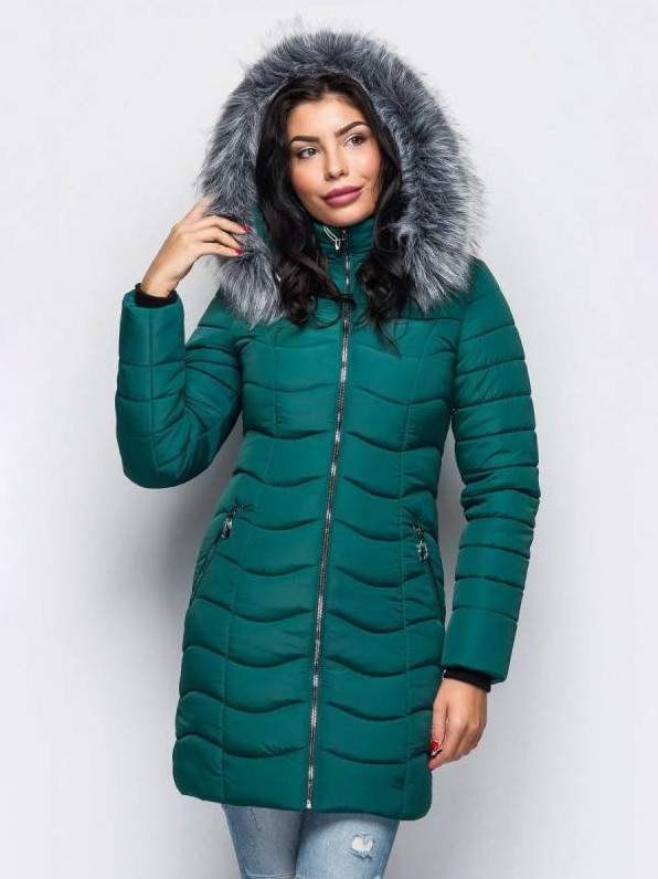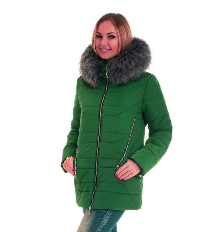 Зеленоватый пуховик дамский с мехом.