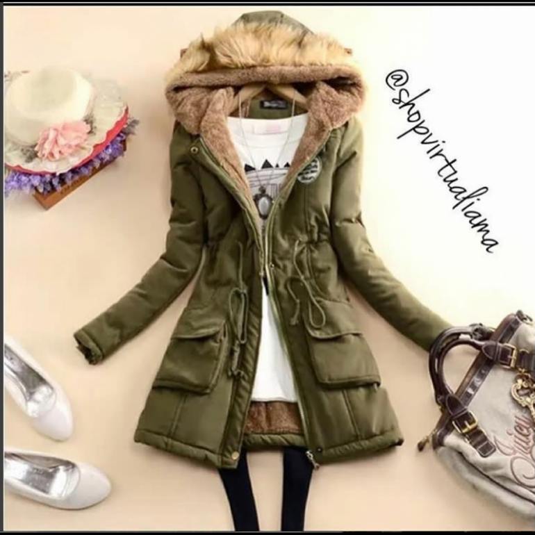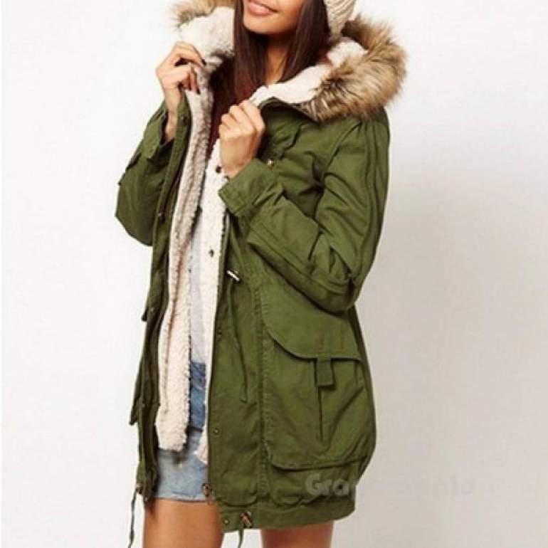 Зеленоватая куртка с мехом.