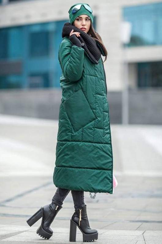 Пуховик изумрудного цвета.