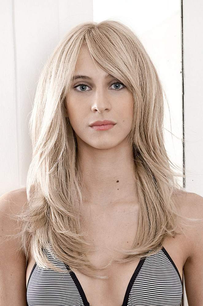 Каскад на длинные волосы с челкой на две стороны.