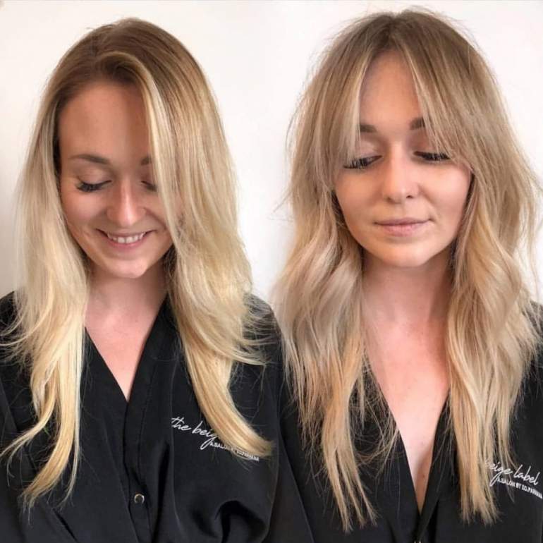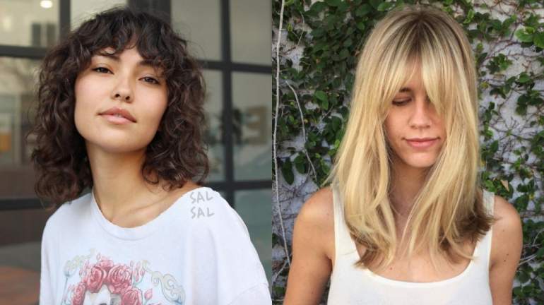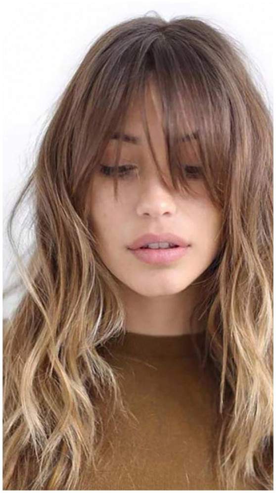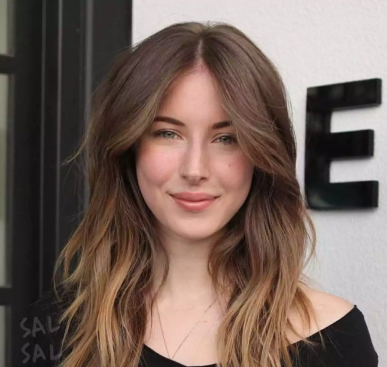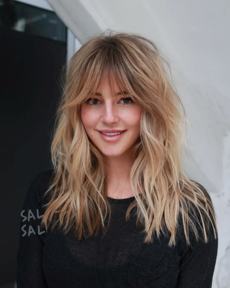 Челка шторка на волнистых волосах.