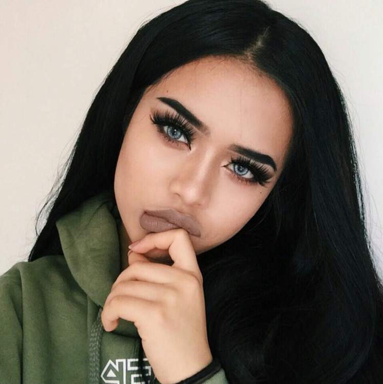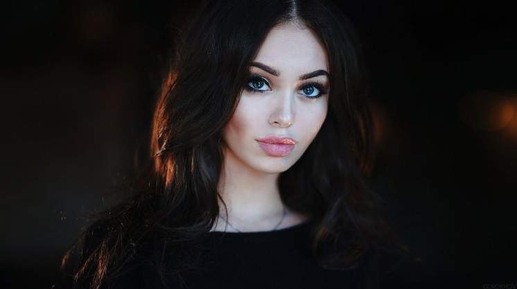 Девушка с чёрными волосами и голубыми глазами.