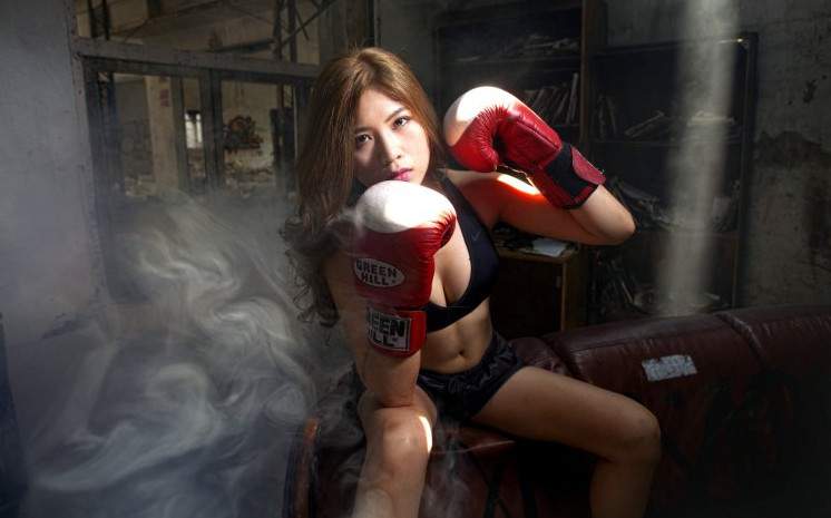 Азиатка в боксёрских перчатках.