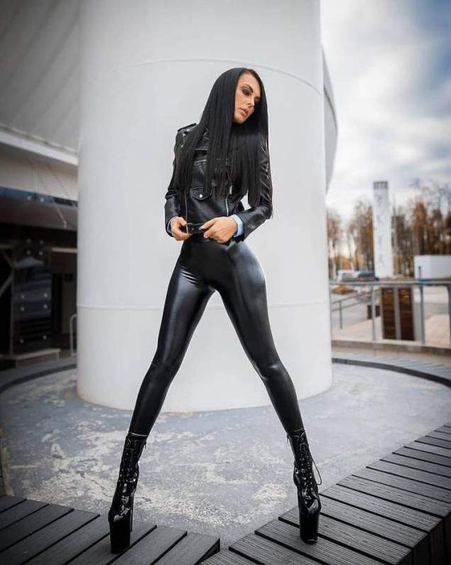 Восхитительные женщины в кожаных леггинсах сзаду.