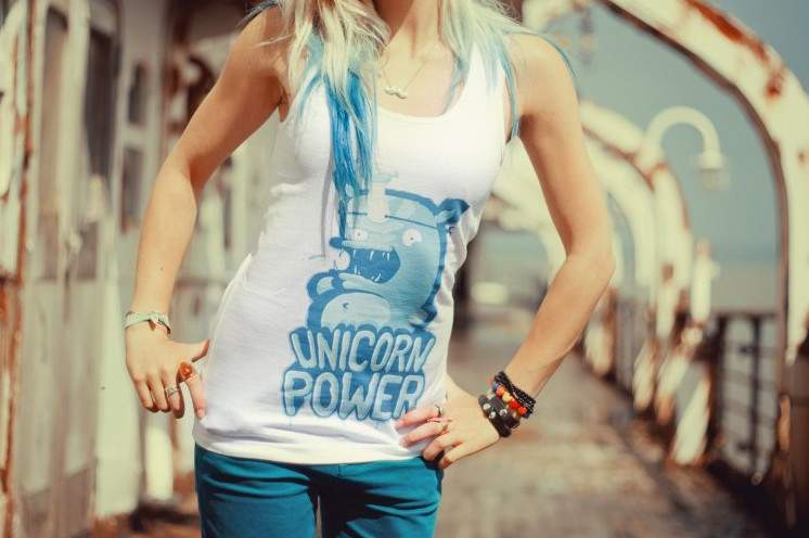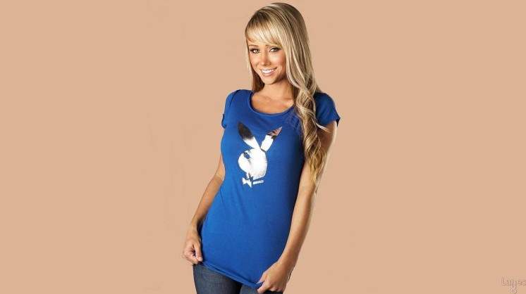 Голубая футболка на симпотичной девушке.