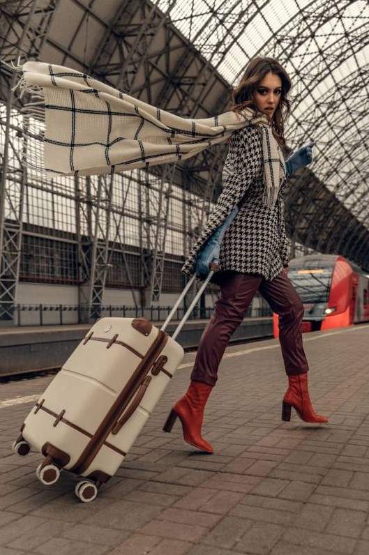 Девушка с чемоданом в клеточку.
