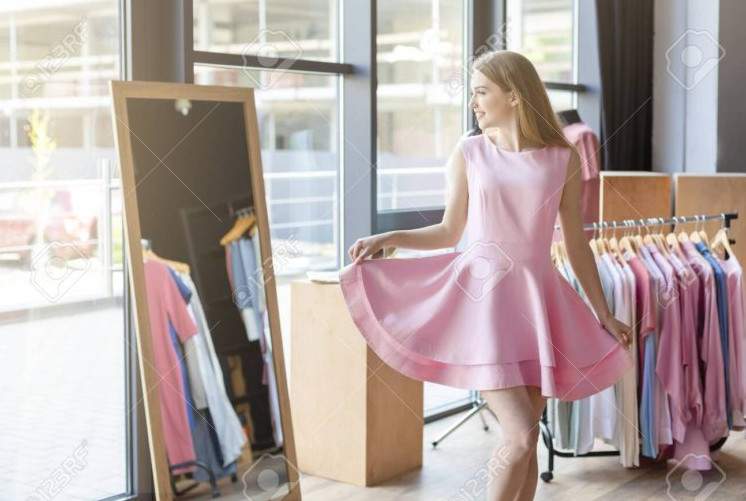 Красивая девушка примеряет прекрасное платье перед зеркалом.