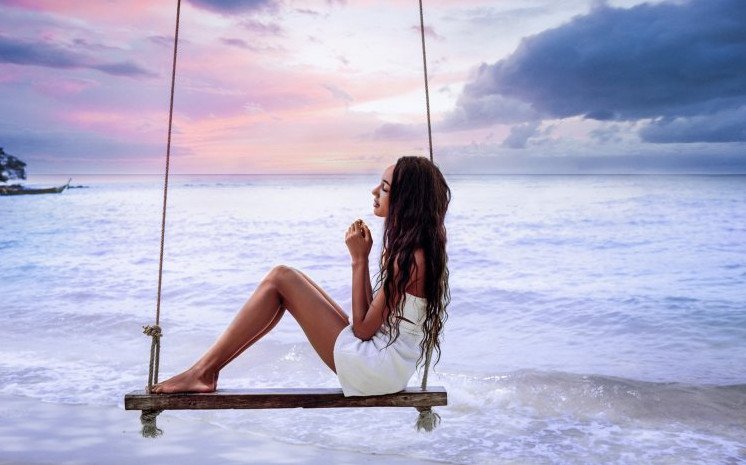 Девушка на качелях на берегу моря.