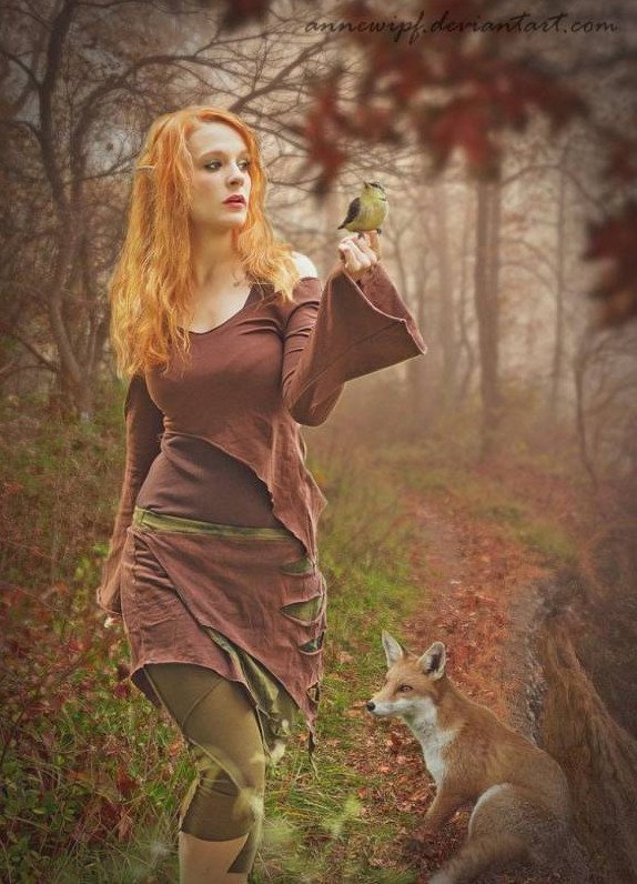 Девушка с лисой в лесу.