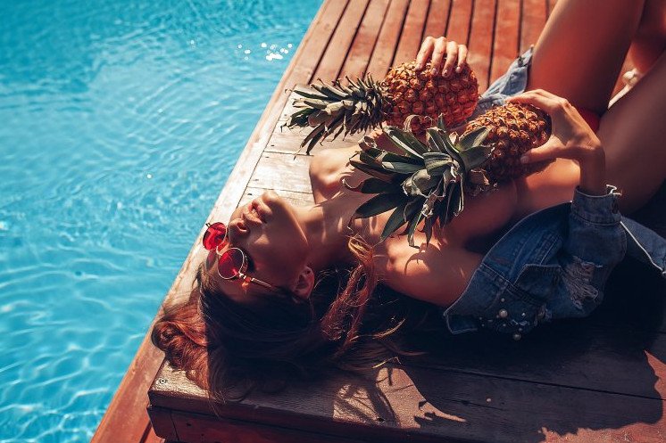 Девушка в бассейне с фруктами.