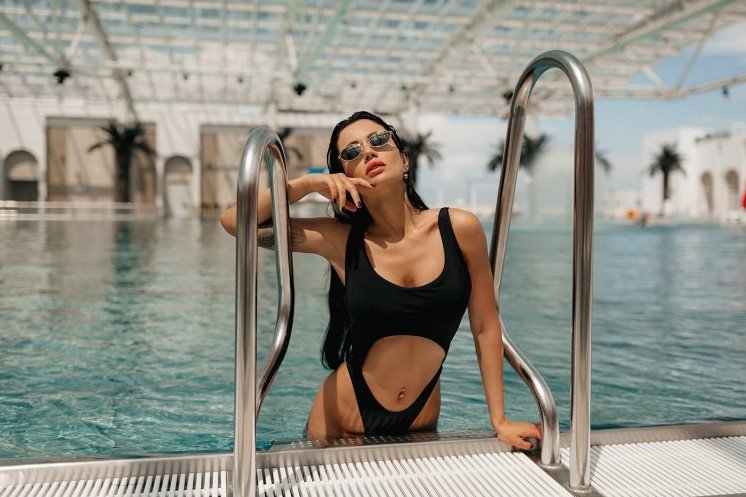 Девушка в купальнике около бассейна.