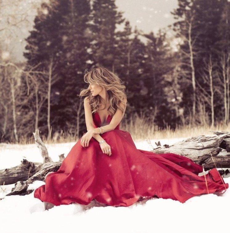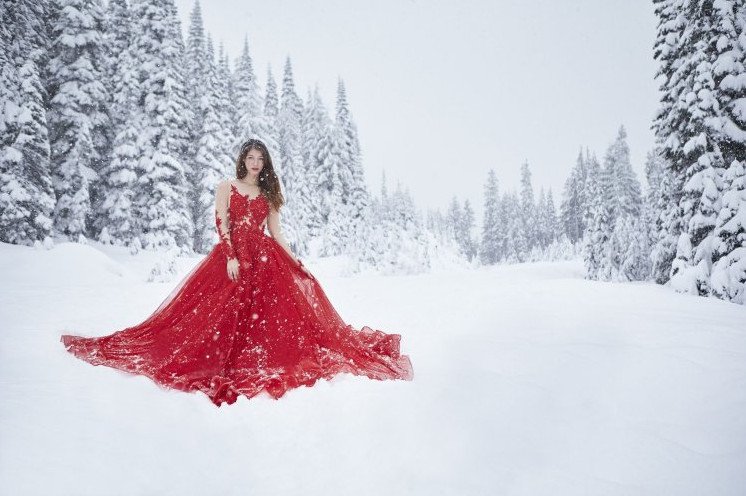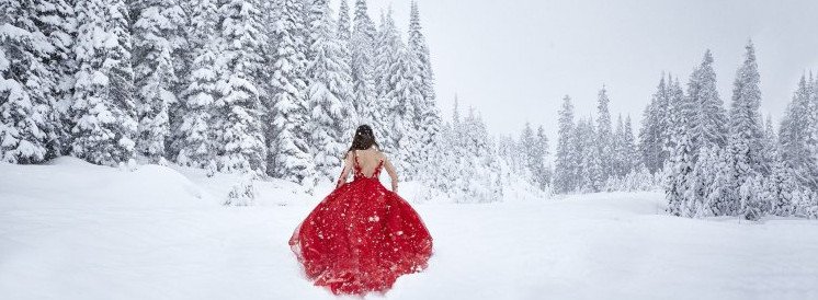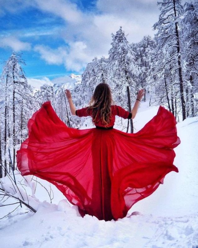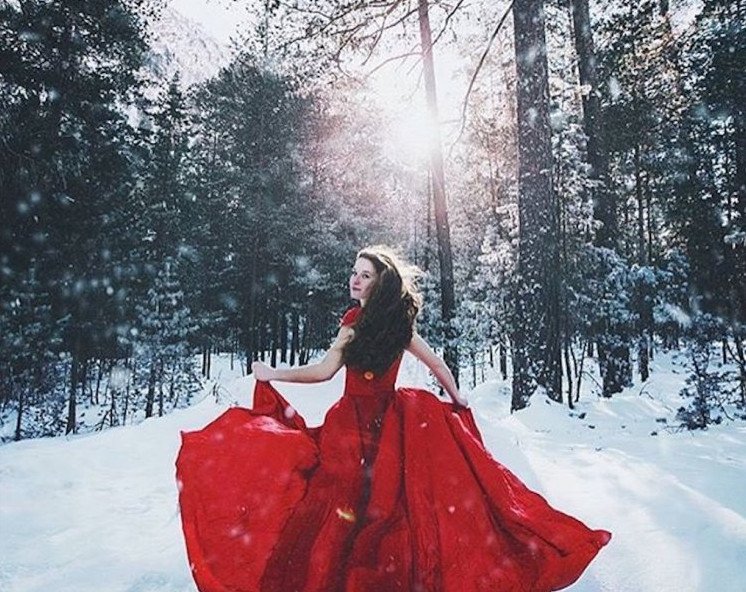 Фотосессия в зимнюю пору в лесу в прекрасное платье.