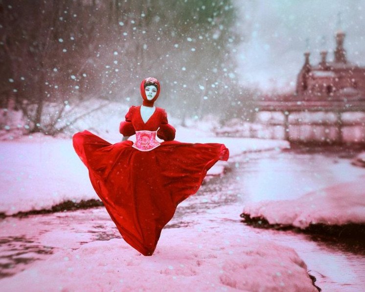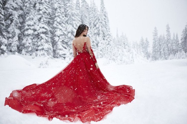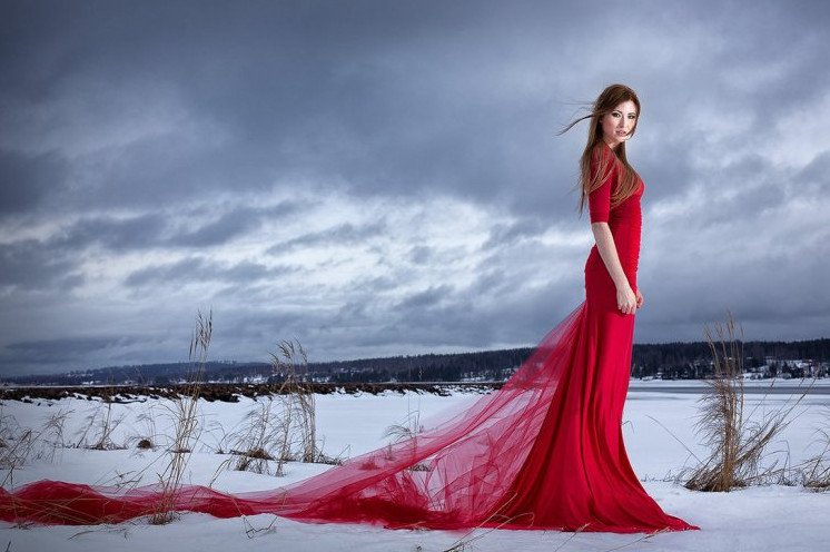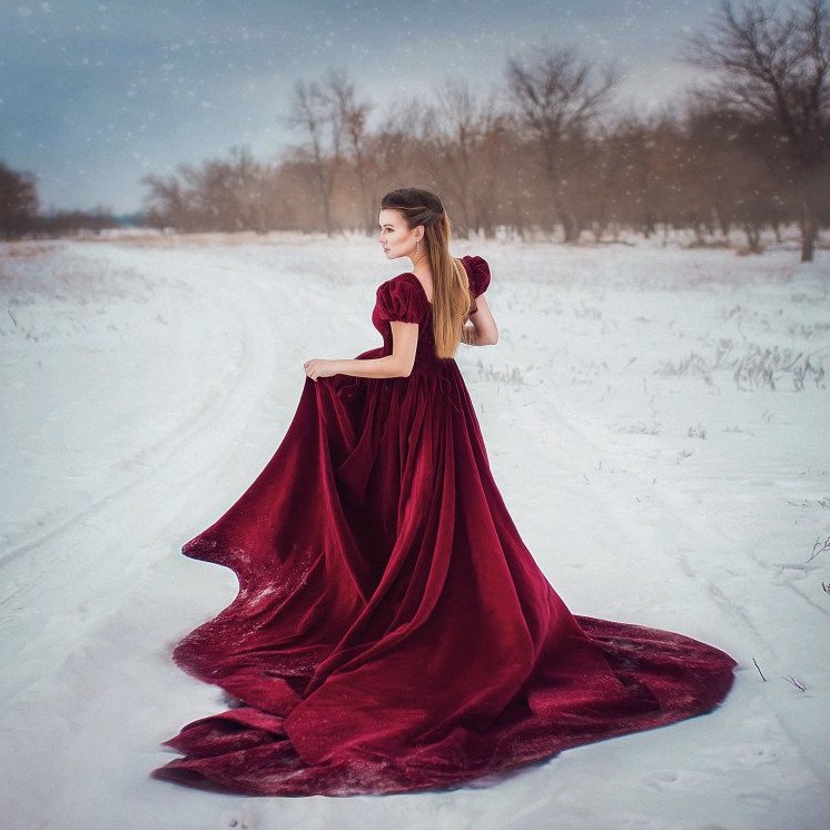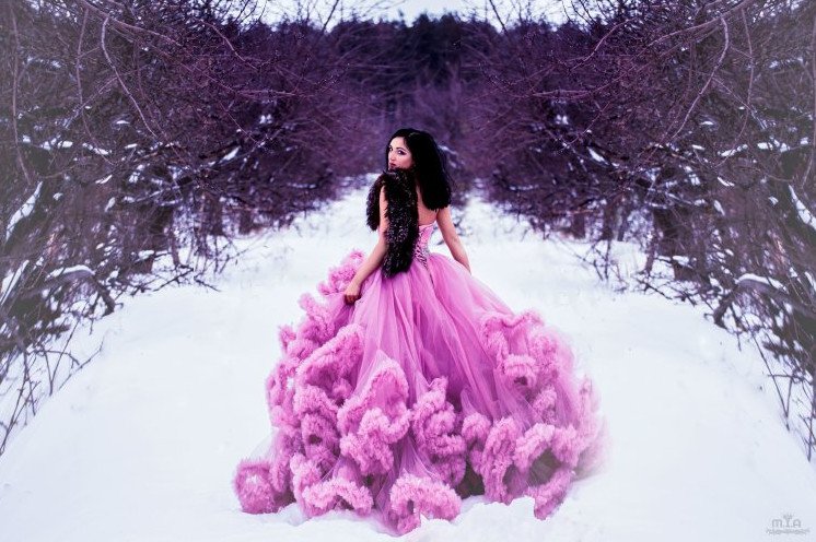 Фотосессия в пышном прекрасное платье в зимнюю пору.